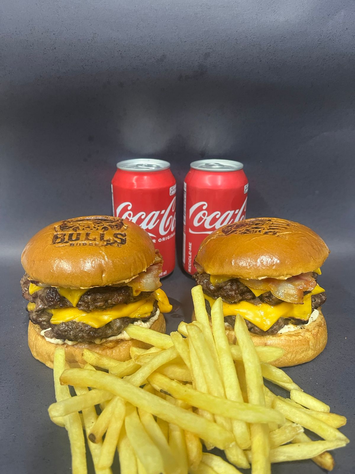Dois Bulls Bacon Duplo Pão brioche, 2 carnes artesanais de 150g, queijo cheddar, Bacon e Maionese de Bacon. Acompanha duas cocas latas e duas porções de batata