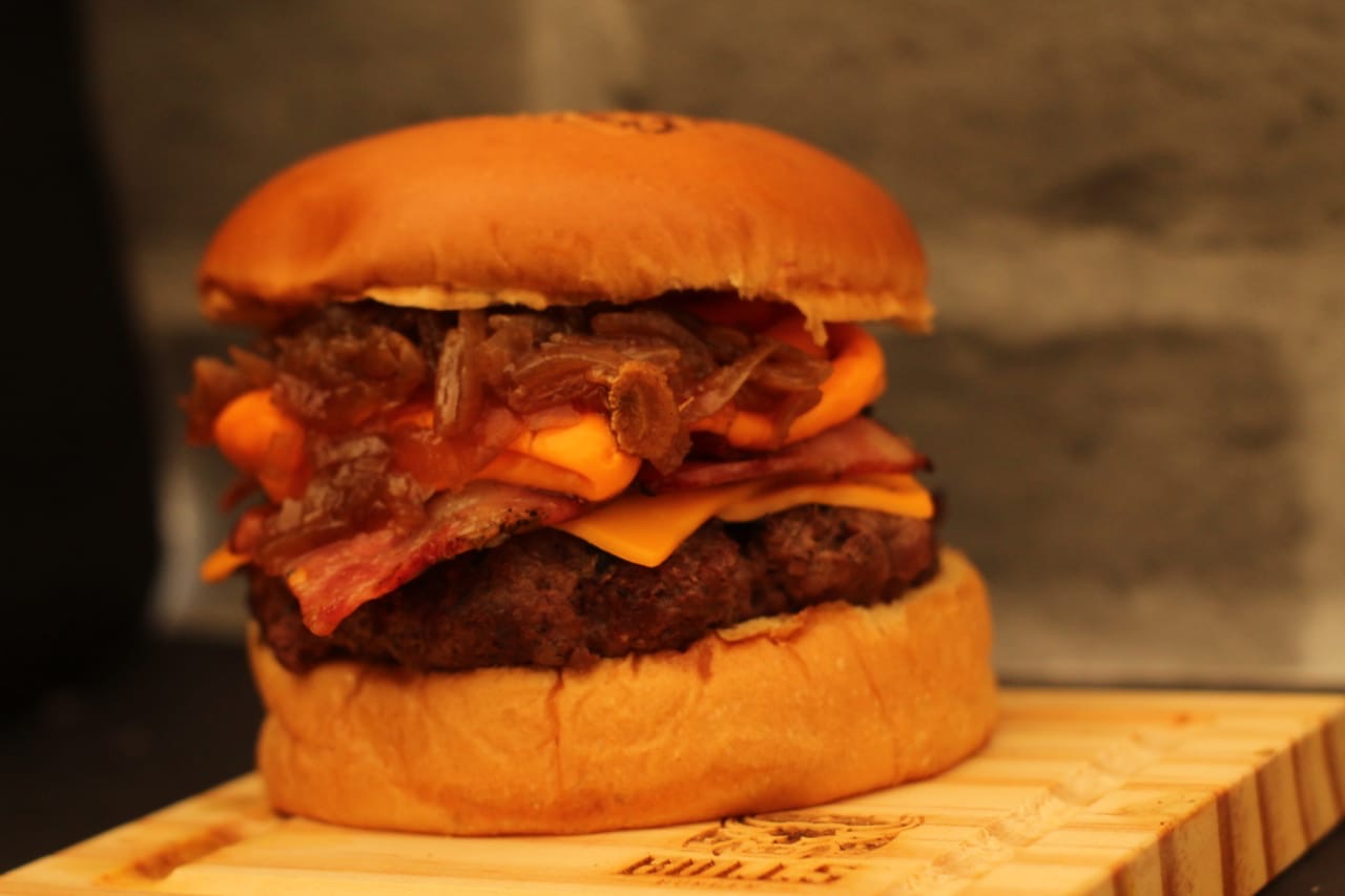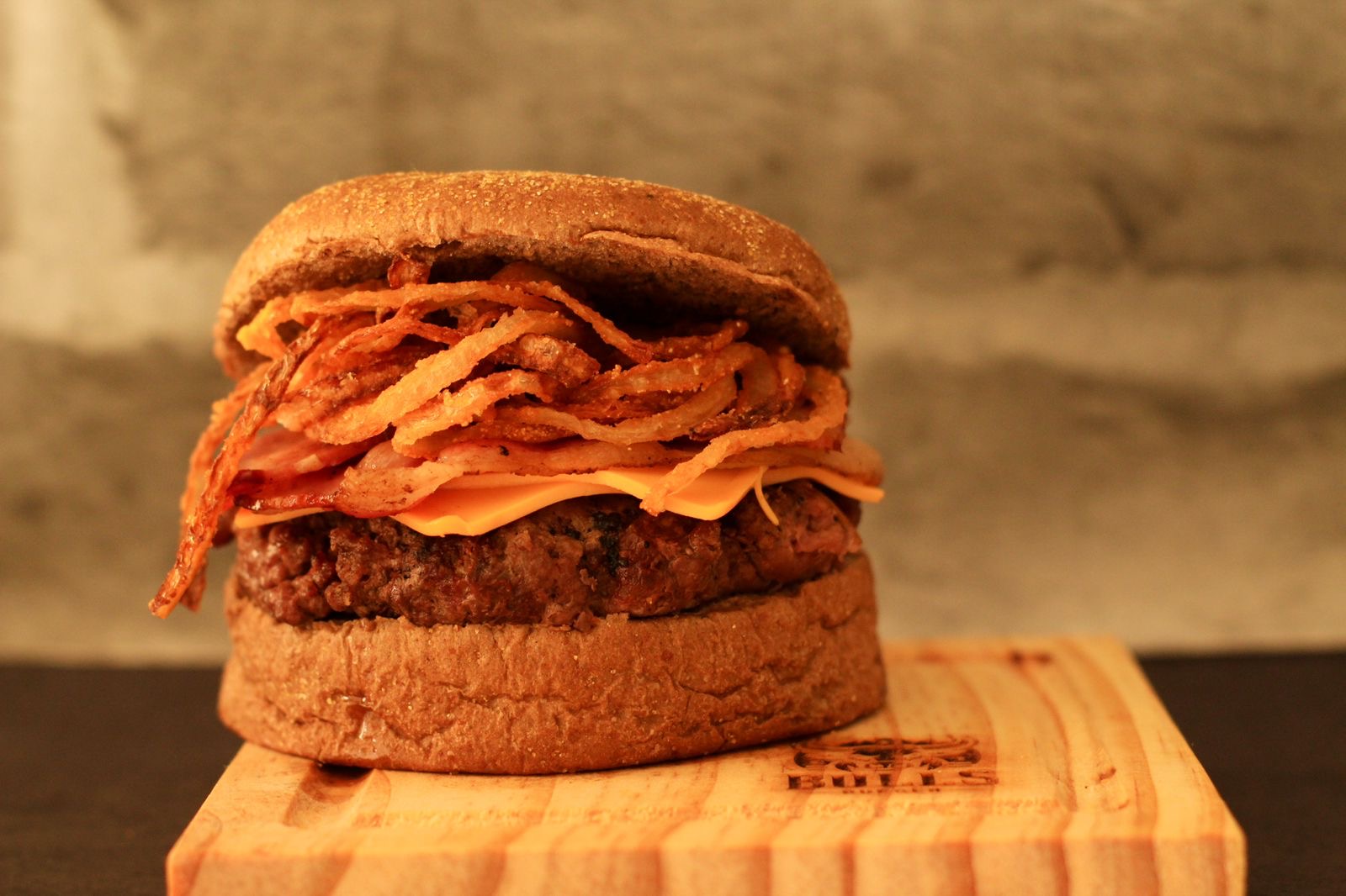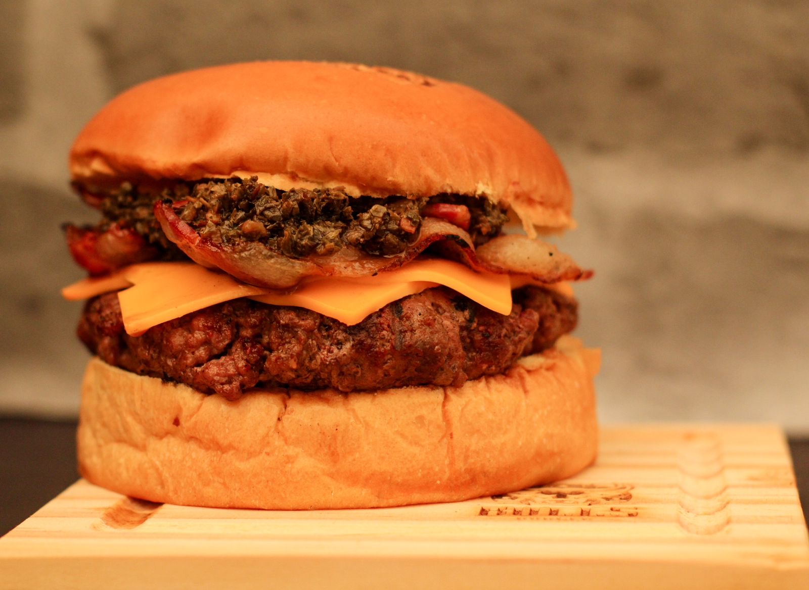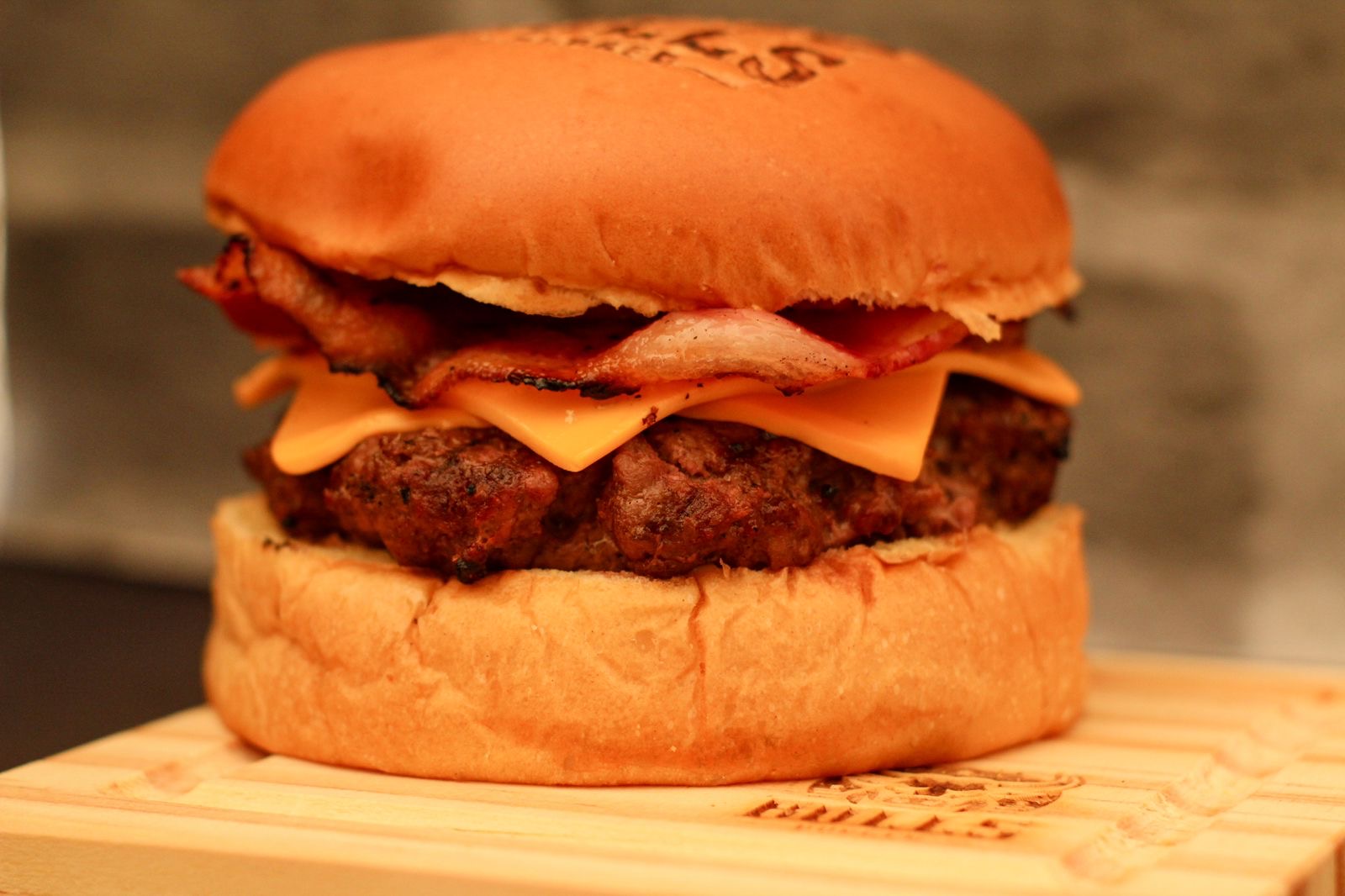 - pão brioche, hambúrguer de 150g, queijo cheddar, Bacon em fatias, maionese de Bacon e molho chimichuri.