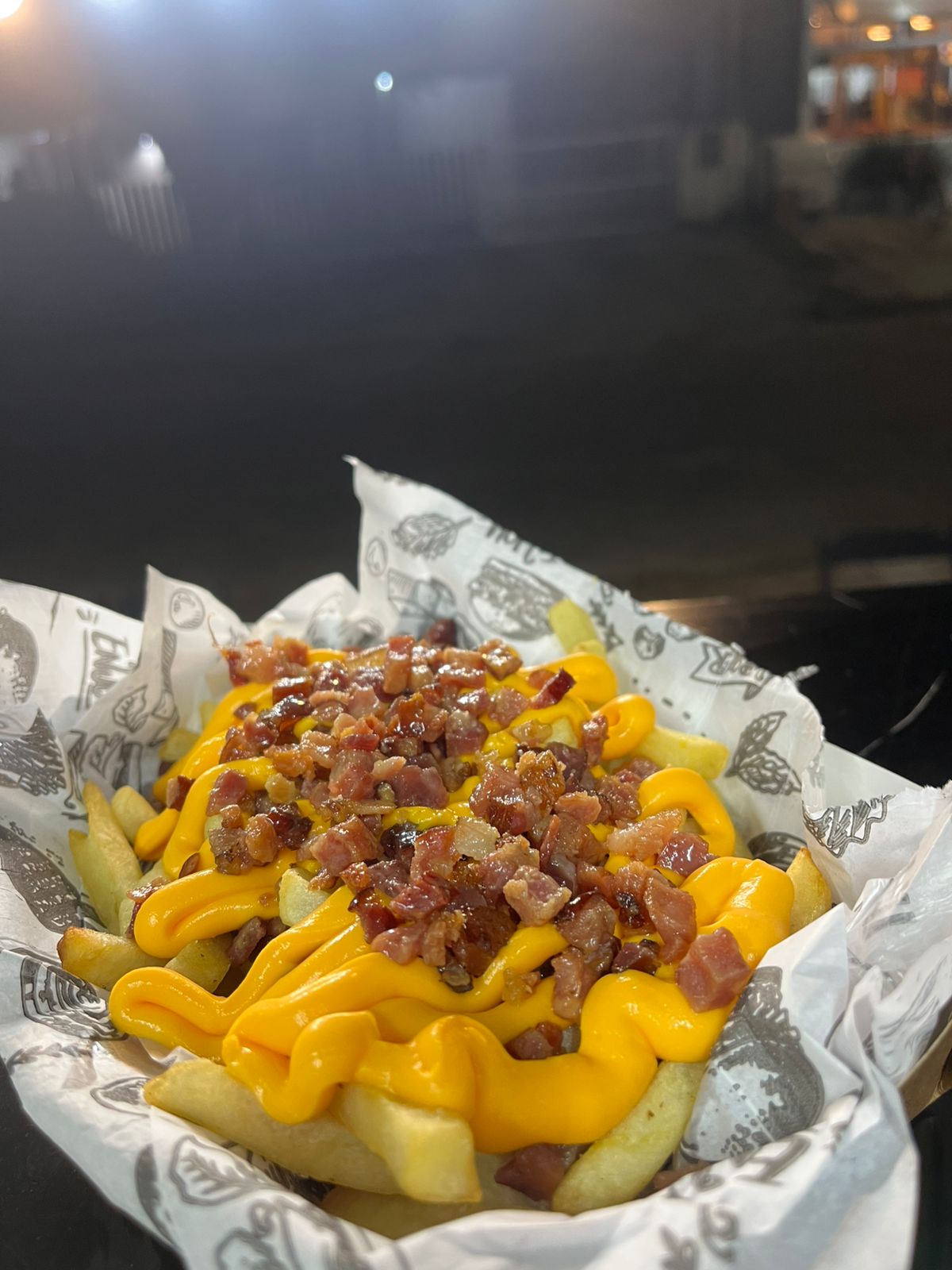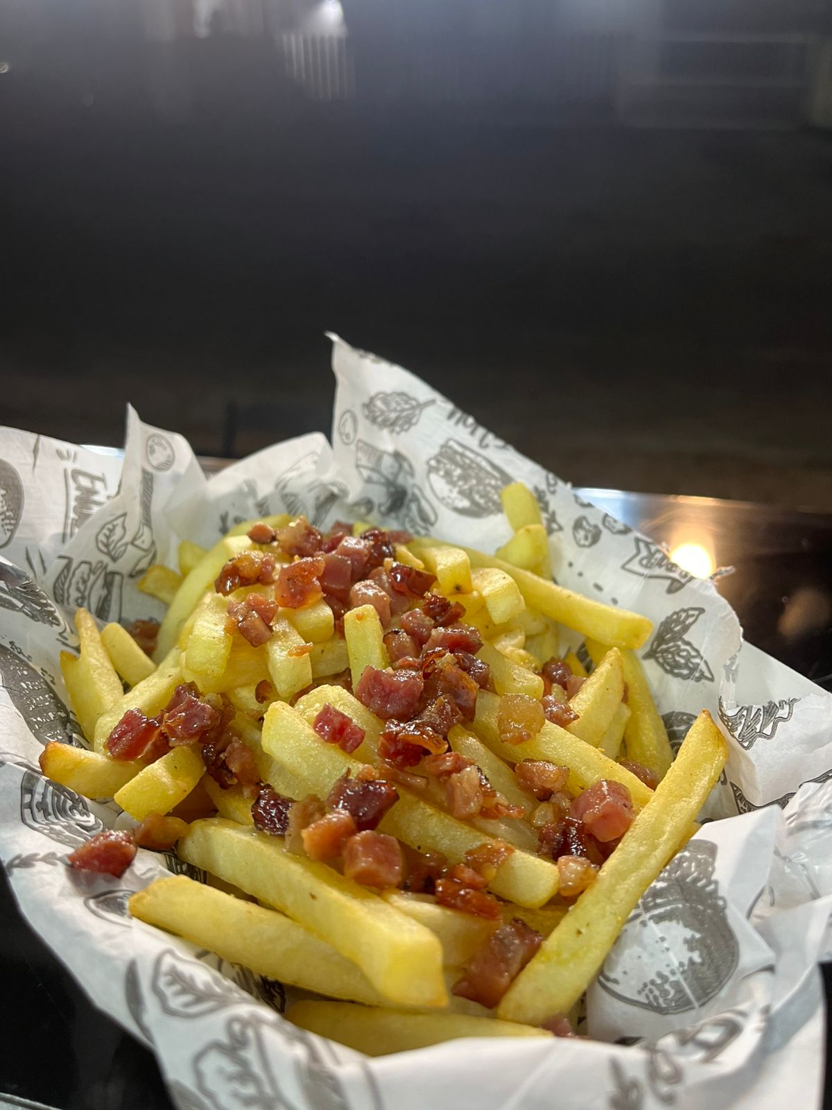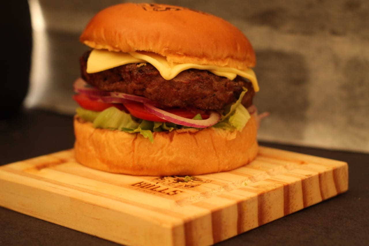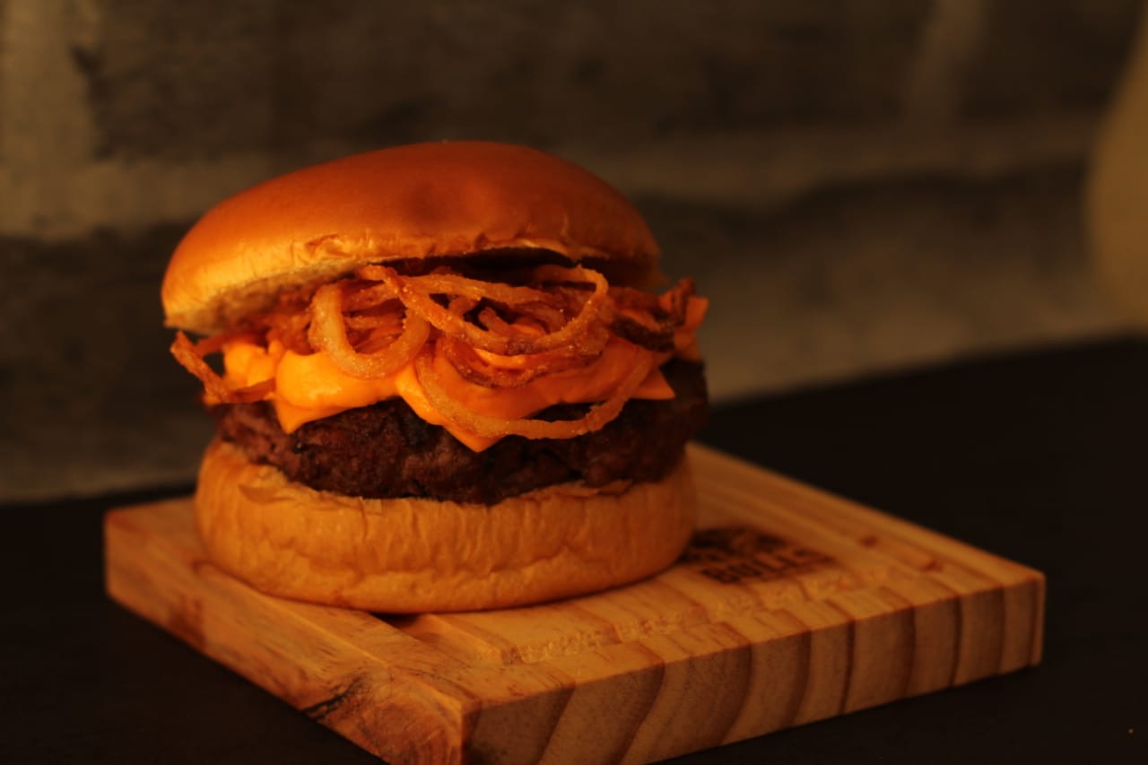 - pão brioche, hambúrguer de 150g, queijo cheddar, Bacon em fatias, maionese de Bacon e molho chimichuri.
