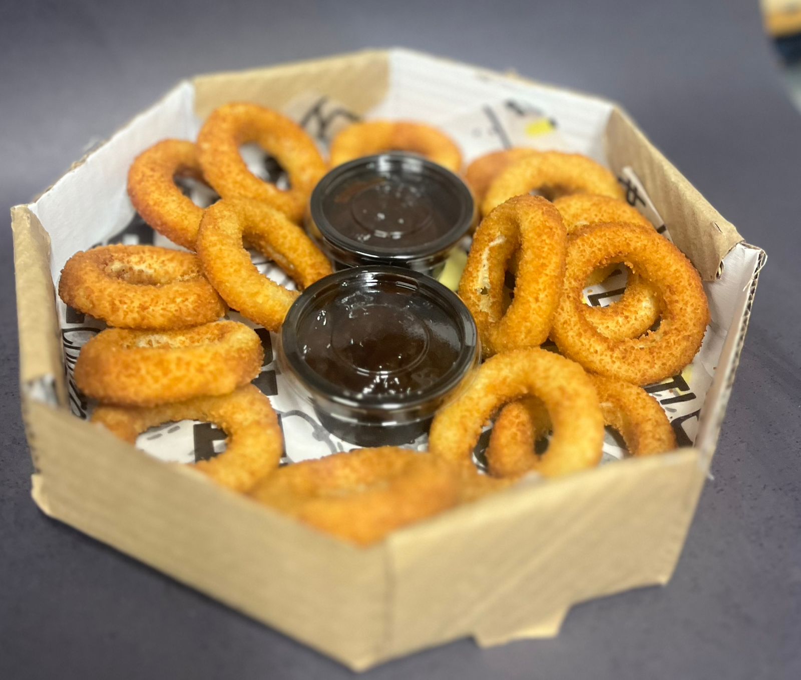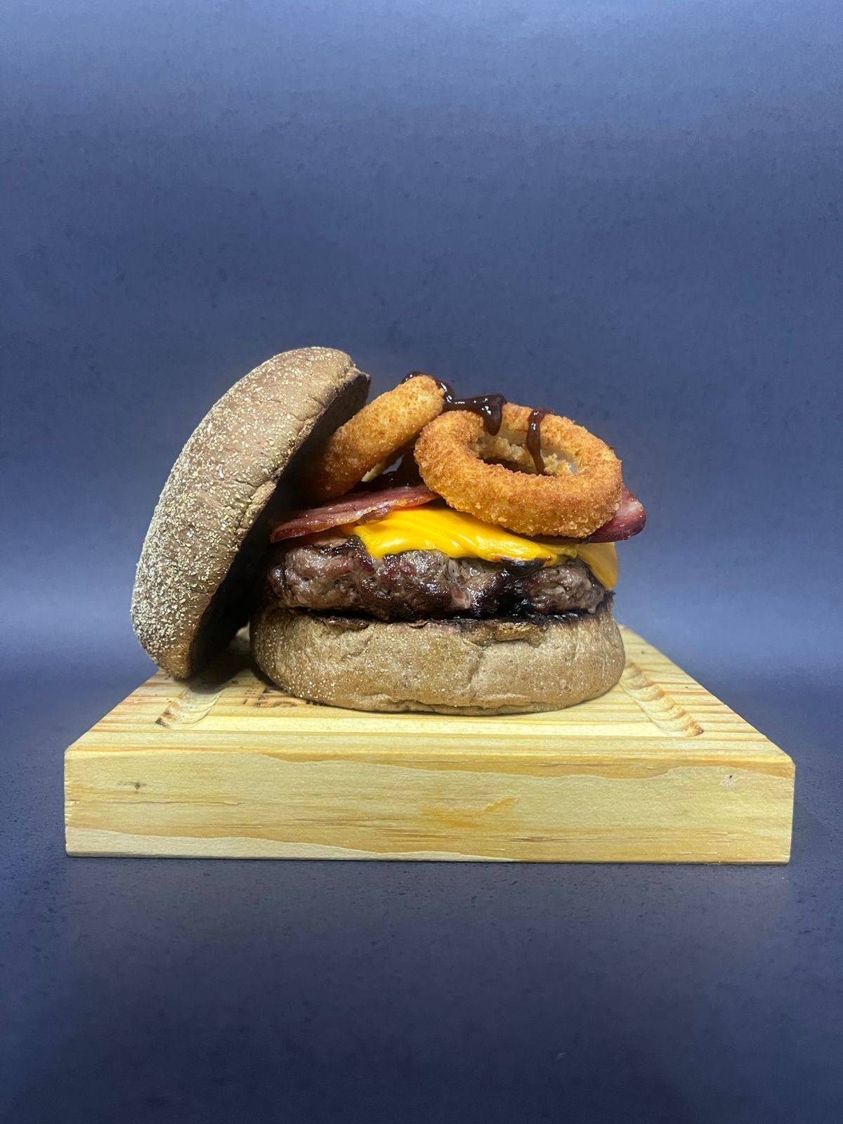 Pão australiano, hambúrguer artesanal de 150g, queijo cheddar, fatias de bacon, onion rings e molho barbecue
