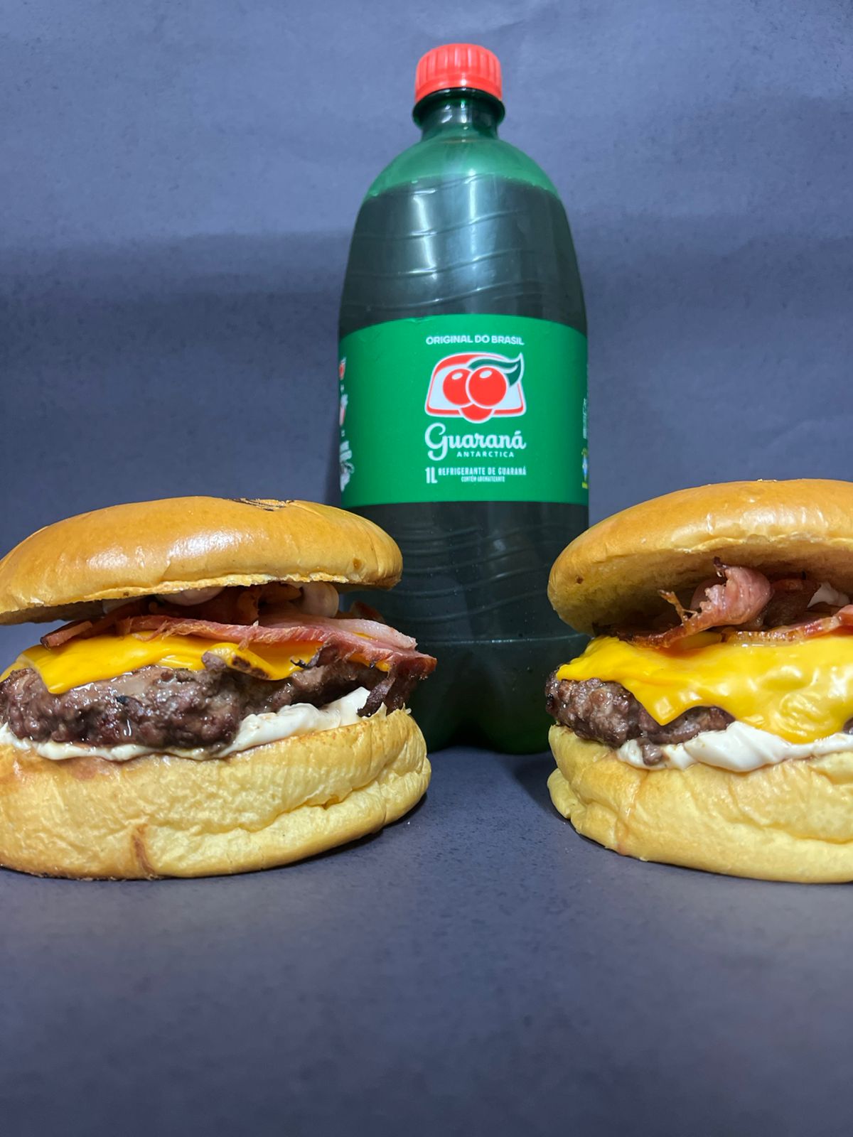 2 Burguers, Pão brioche, carne artesanal de 150g, queijo cheddar, Bacon, maionese de Bacon e um Guaraná 1l