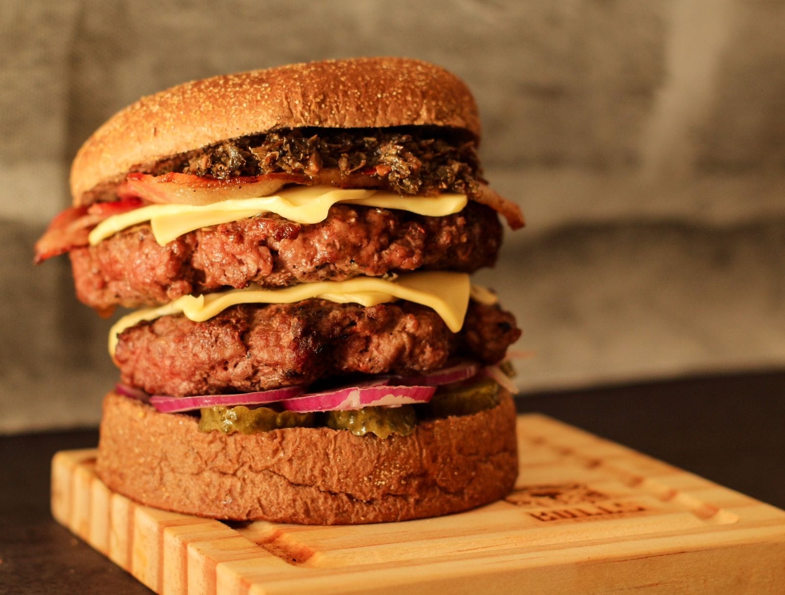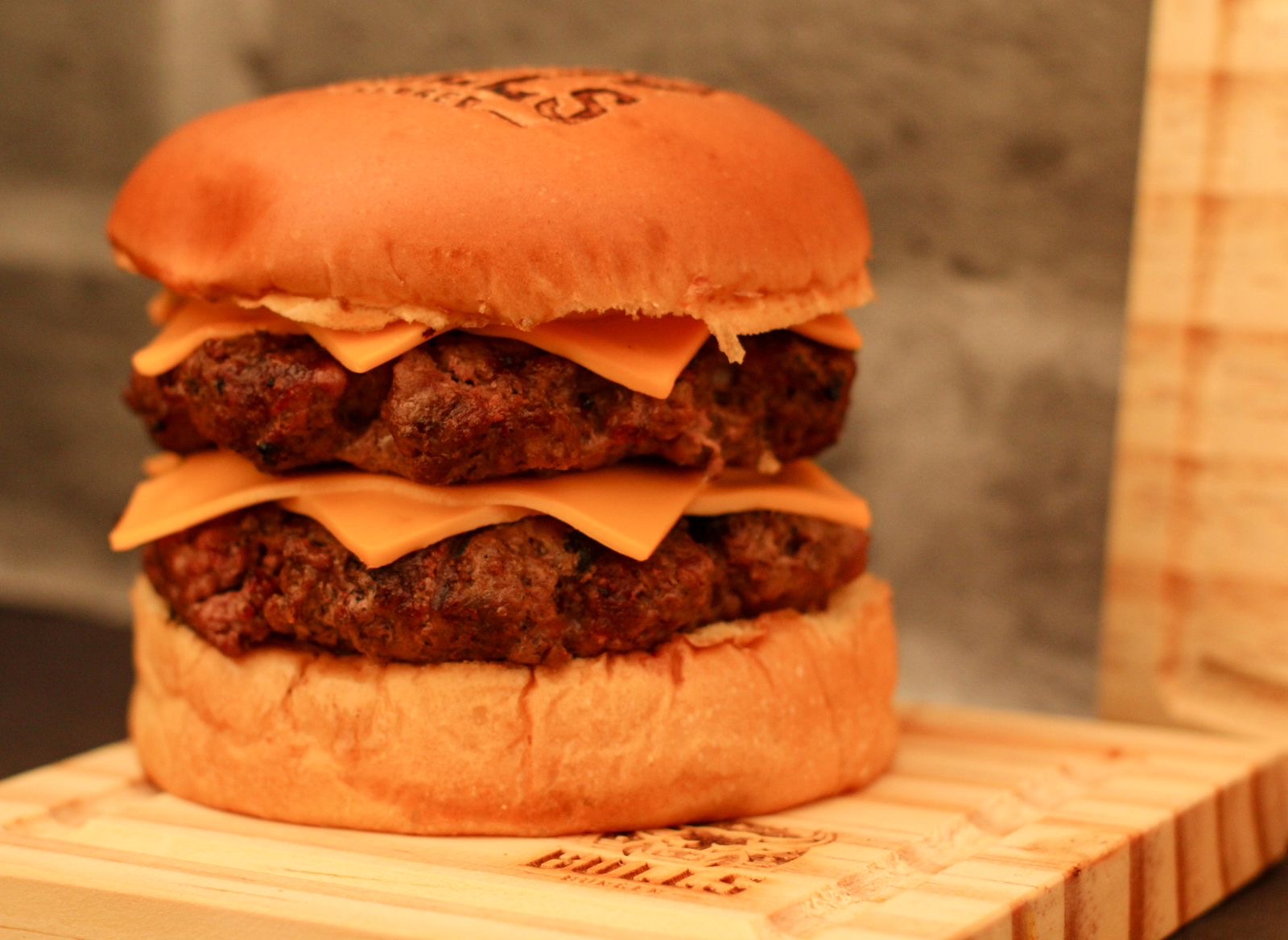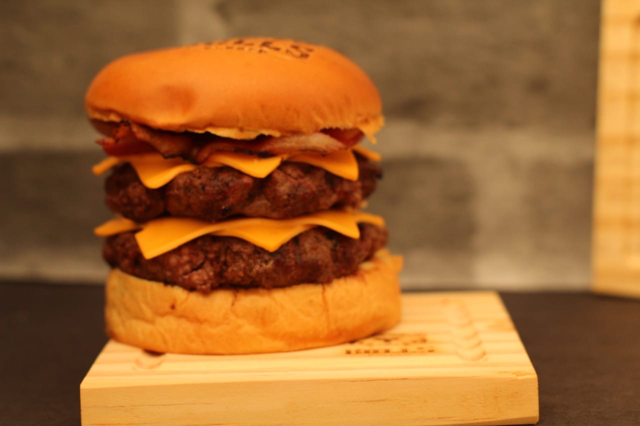 pão brioche, 2 hambúrgueres de 150g, queijo cheddar, maionese defumada.
