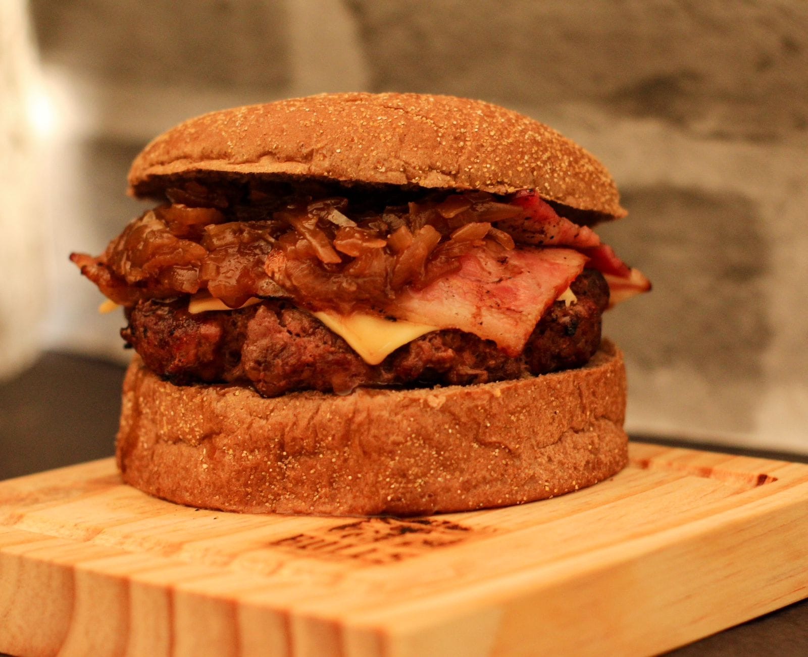pão australiano, hambúrguer de 150g, cheddar cremoso, cebola caramelizada feita na casa, bacon e maionese defumada