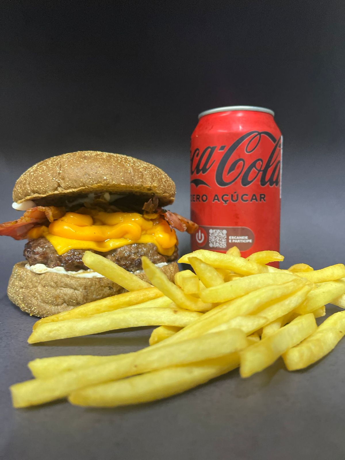 Nosso delicioso Bulls Cheddar acompanhado de 200g de batata frita e uma coca cola lata
